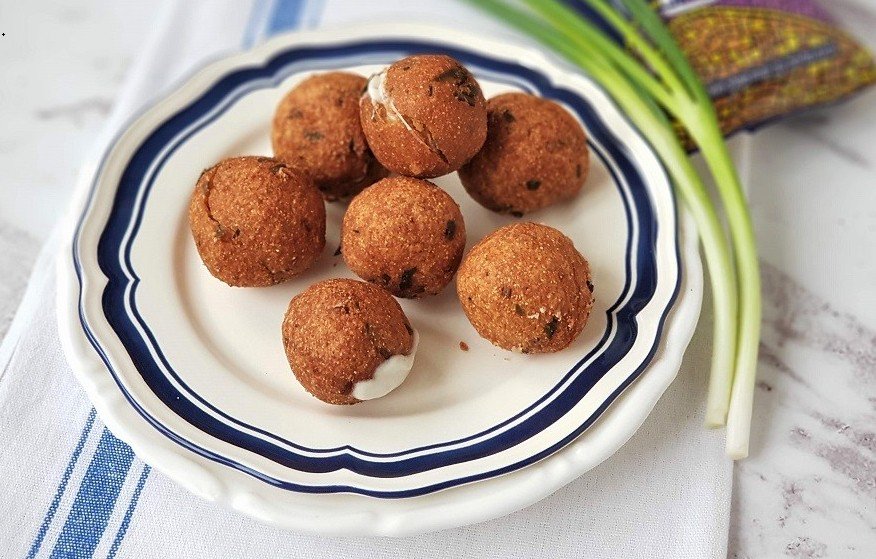 2. Heat oil in a pot. Scoop dough using an ice-cream scoop. Press a cube of Feta in the middle and cover with more dough. Drop the scooped dough into the hot oil.