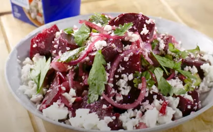 4. Crumble the Feta cheese on top. Sprinkle with the chopped nuts. Toss and serve.