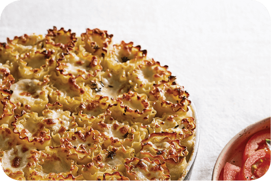 8. Take the pan out of the oven and remove covering. Sprinkle Tnuva Edam Cheese pieces all around the lasagna rosettes and bake for another 6-8 minutes until the cheese turns brown. Serve hot.