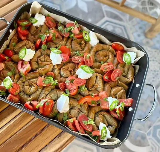 6. Cool slightly. Decorate with tomatoes, labaneh and basil leaves.