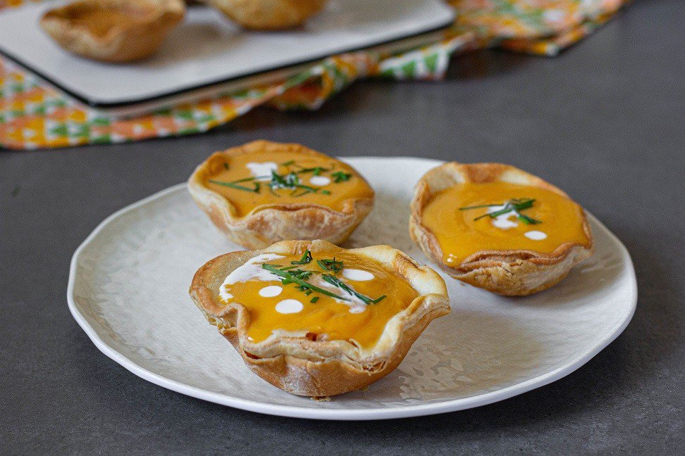 1. To make the bowls, heat oven to 350 ⁰F. Spread the dough on a flat surface. Using a glass or a cookie cutter, cut the dough into circles (about 4-inches) and place them into the muffin tin, creating small round hollow “bowls”. Bake for 30-35 minutes, until golden. Cool and carefully take out of the tin.