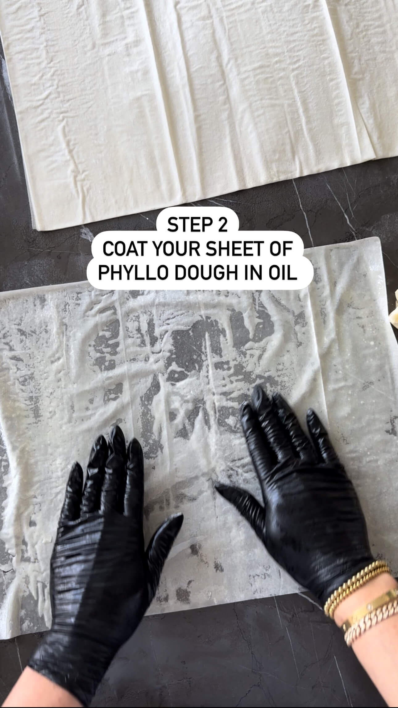 4. Take one sheet of filo dough, gently spray with oil or melted butter, and smooth it out.